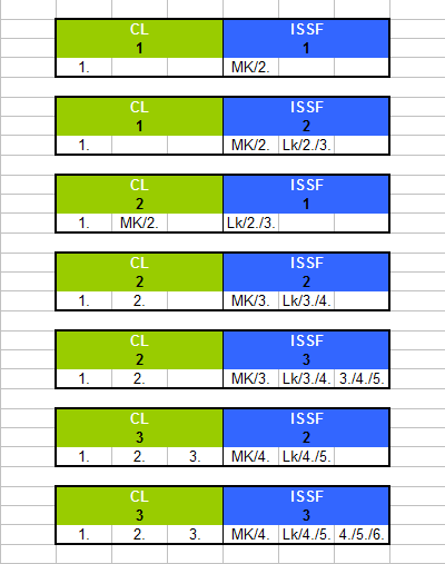 A táblázat fejlécében van, hogy hány helyet kapunk, azaz pl. az utolsó, hetedik blokk a 3 CL és 3 ISSF hely.