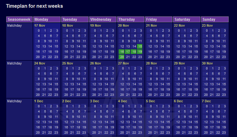 - fixed leagues with fixed matchdays (season is 11 weeks with one league match per week (2 or more legs) + transfers time)