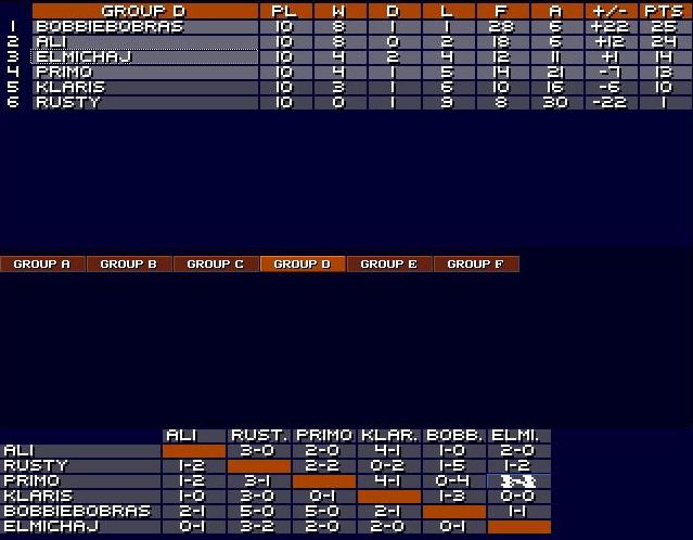 Wow, the groups part finished fast! I guess there were not many problems with PC s! That s great! From the last update Schulle has made a great run and finished second, ElMichaJ is still in second gear, Dzem is a great surprise! To finish above Andypsilon (also great 2nd place), and above Rasmus and Lobo... just great. Group E was extra close... It looks like a great tournament! Cant wait to see draw for 1st elimination round.