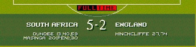 hinchcliffe for england got 1 back but then 3 minutes later masinga found the target making it 3-1 just before half time dundee found the spot again making it 4-1. On the 59th minute dundee got his hat trick making it 5-1 hinchcliffe scored on the 74th but england never looked like coming back a great result!