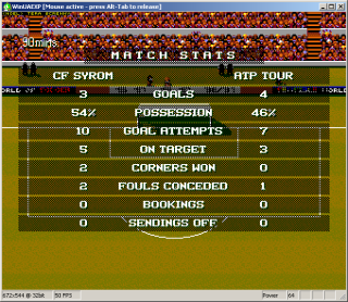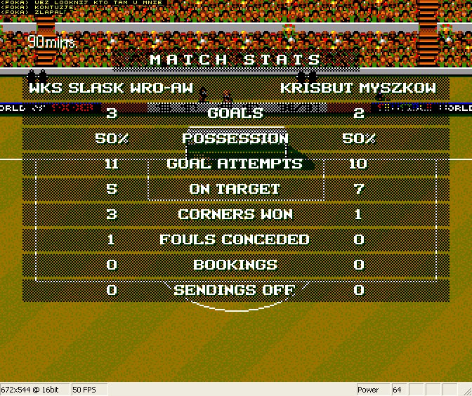 Piękny mecz, piękna walka i mój bohaterski i honorowy wjazd do bramki w ostatniej minucie (po tym poznać prawdziwa mendę). Pierwsza połowa to 3 szybkie bramki Atp i mecz wydawałby się przesadzony przed przerwrą. Druga połowa to jednak gra pod dyktando gospodarzy i również trzy szybkie brameczki po składnych akcjach. 3-3 i próba sił. Kto zdobędzie decydującego gola. W tym miejscu muszę dodać że moja nieporadność sięgnęła zenitu. Mając kontuzjowanego zawodnika nie mogłem go zmienić bo grałem nowym joyem i niepotrafiłem wysunąć ławki rezerwowych. W końcu 89 min i po tym jak już pisałem można poznać, cwaną, zuchwała i przebiegłą mendę która gra w swosa od kilku lat i musi wygrać za wszelką cenę bo zabawa sie nie liczy - wjazd do bramy i 3-4. Pozdro