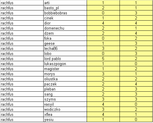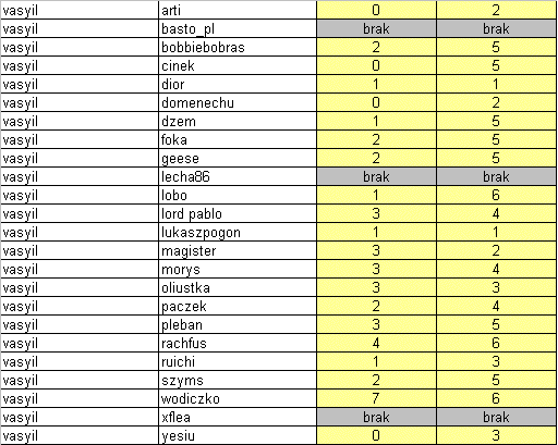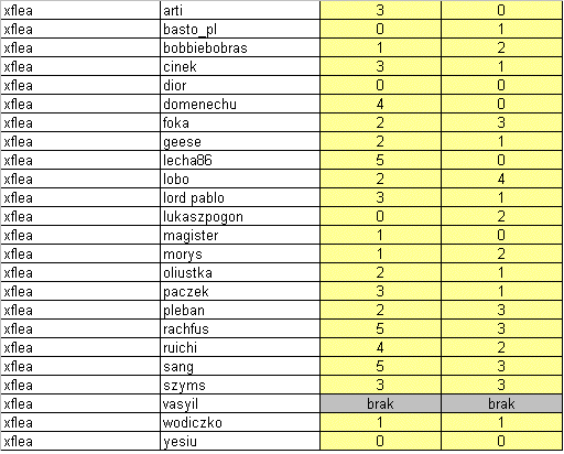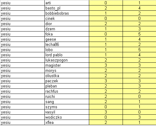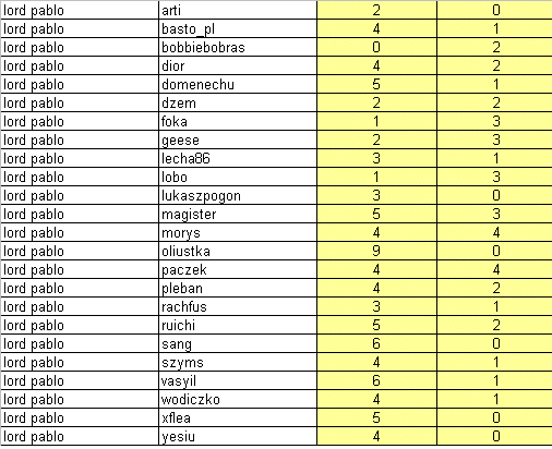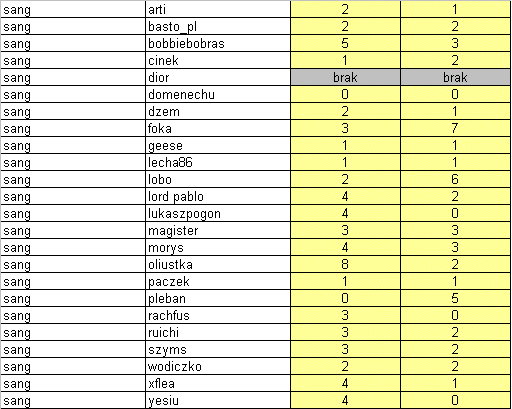 Przypominam, że jeśli chociaż jeden gracz z danej drużyny nie rozegra swoich gier , to obaj zostaną ukarani zakazem gier w następnych organizowanych cupach. Tak więc proponuje się zmobilizować. Rozegrane mecze nie będą miały większego wpływu na końcową tabele poza pojedynkiem Diora z Sangiem. Dior może awansować swój zespół na pozycje 5tą kosztem Grupy Trzymającej Władze. Bez względu na wszystko z turniejem żegnają się Sang i Vasyil czyli zespół Świętej Wojny.