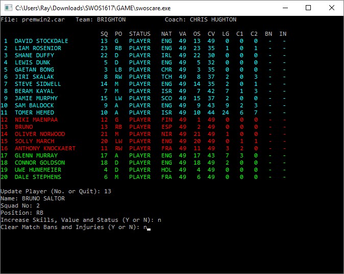 It originates from six years ago and will now run in any version of Windows from XP to Windows 10. On launching SWOSCARE it requests the full .CAR filename with extension. It then offers the choice of a squad display with either career details or skills. I attach three screenshots covering most of the options: