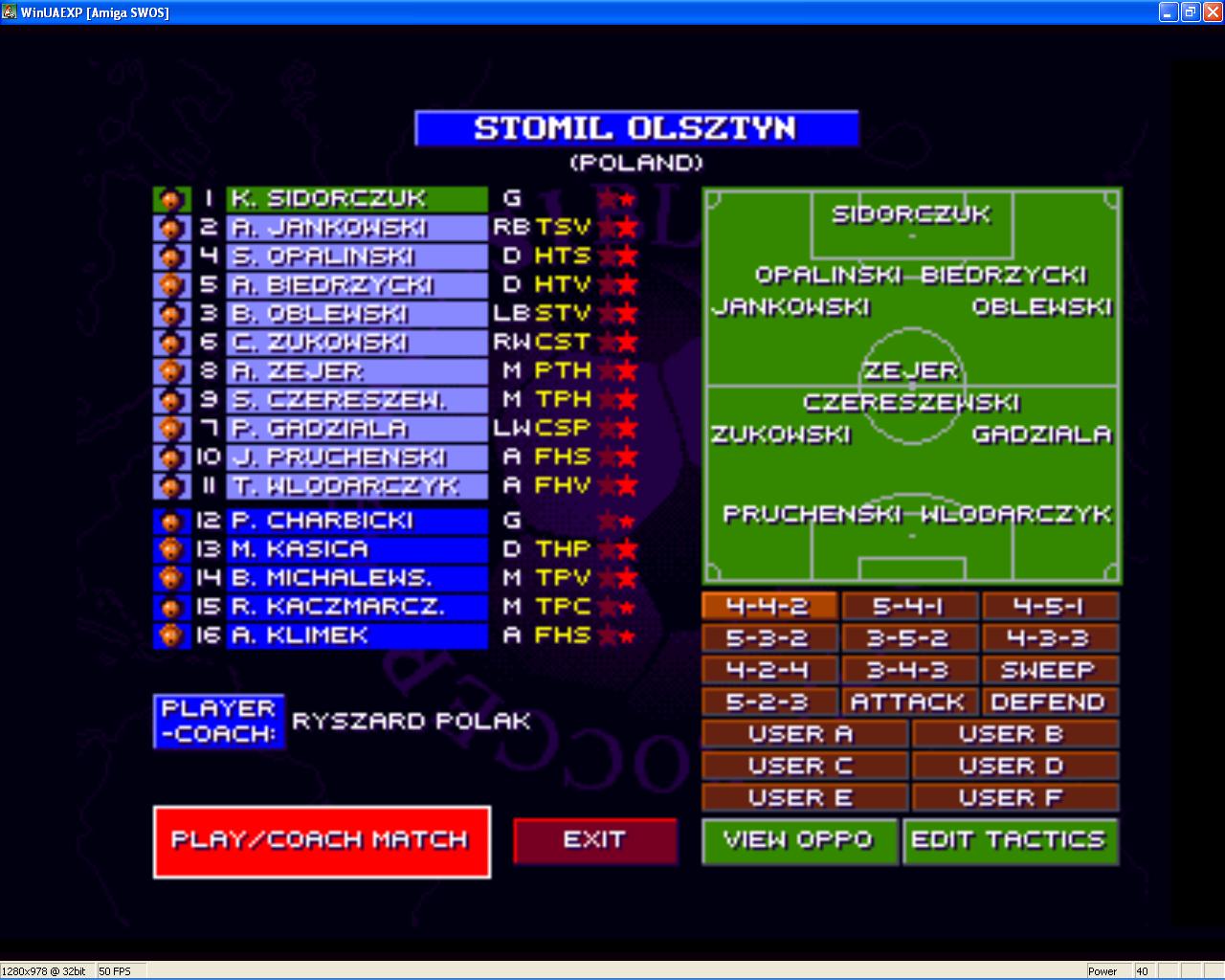 After the draw everyone knows which team he have to play in this tourney. Those, who were live at the draw know it immediately, and those, who were not there will receive an email on ss.de. SPECIAL: Your team MUST be edited in the Edit Custom Teams section of SWOS with your favourite HOMETOWN- (HOMECOUNTRY) -club (if there are 2 or more players who choose the same team the lower ranked player got it first. So no team will be twice in the competition). So please edit the team you got from the draw with the teamdata of the CURRENT SEASON or the season of 96/97 in the Edit Custom Teams and make a screenshot and post it here in the thread. After I got all teams I make a savedisk which will be used for this Cup.