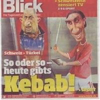 I was waiting to write this since 2005 where we called again barbarian Turks after the world cup qualification game Turkey vs Swiss... As you know I am not a nationalis but the Swiss press wanted to eat kebab. Before the game today there was a picture on newspapers in Swiss where a Swiss national player wanted to cut Turkey coach Fatih Terim as a kebab... They said today, we ll eat kebab.
