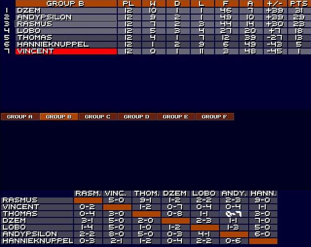 Wow, the groups part finished fast! I guess there were not many problems with PC s! That s great! From the last update Schulle has made a great run and finished second, ElMichaJ is still in second gear, Dzem is a great surprise! To finish above Andypsilon (also great 2nd place), and above Rasmus and Lobo... just great. Group E was extra close... It looks like a great tournament! Cant wait to see draw for 1st elimination round.