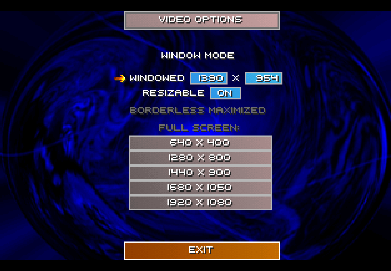 - VIDEO menu with options for fullscreen, preset window modes, resizable and maximizable window.