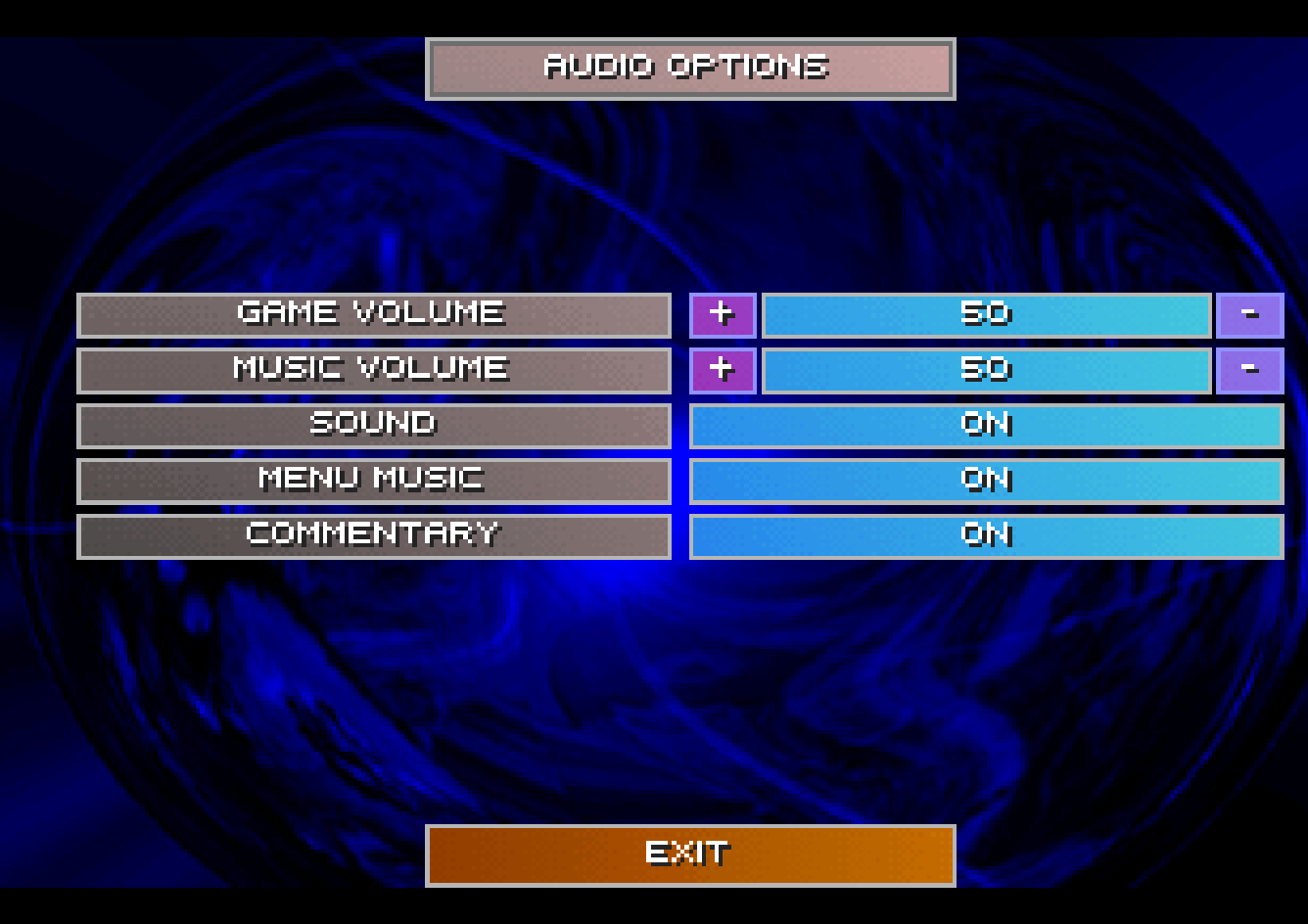 - AUDIO menu with options to increase/decrease sound for both music and SFX (both togglable)