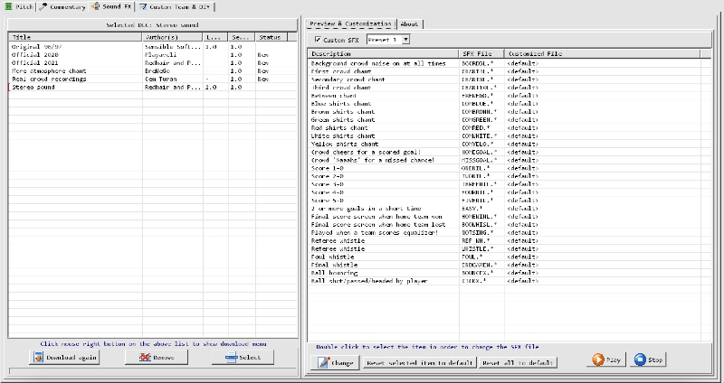 For Sound FX, still missing is: to be able to choose the 'default SFX' to use as Custom SFX, e.g. using the FOURNIL.RAW of SWOS2020 version on the sample for Score 2-0 - TWONIL.* because it is less repetitive. I personally will just add them manually to one of the folders though, since I already got elaborate SFX sets for Liverpool (also thought the Virgil van Dijk chant I did sent to Starwindz would be in for Liverpool, since on a season in SWOS2020 I like that you start with players that were available at the start of that season, so he is still in then ;-) and simulate a season where he could get injured or not) and for playing with the international team from the Netherlands.