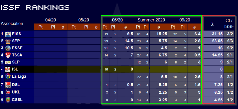 the ISSF Cups have started again. Winners of each national league will go to Champions League and play a small league about the medals. But SRN will be higher. Second Place or Cup Winner of each nation will go to ISSF Cup. I thought about KO matches, but leagues are better when playing activity is not that high in these cups. It can be switched to KO games if we have 8 leagues and a lot af activity there.